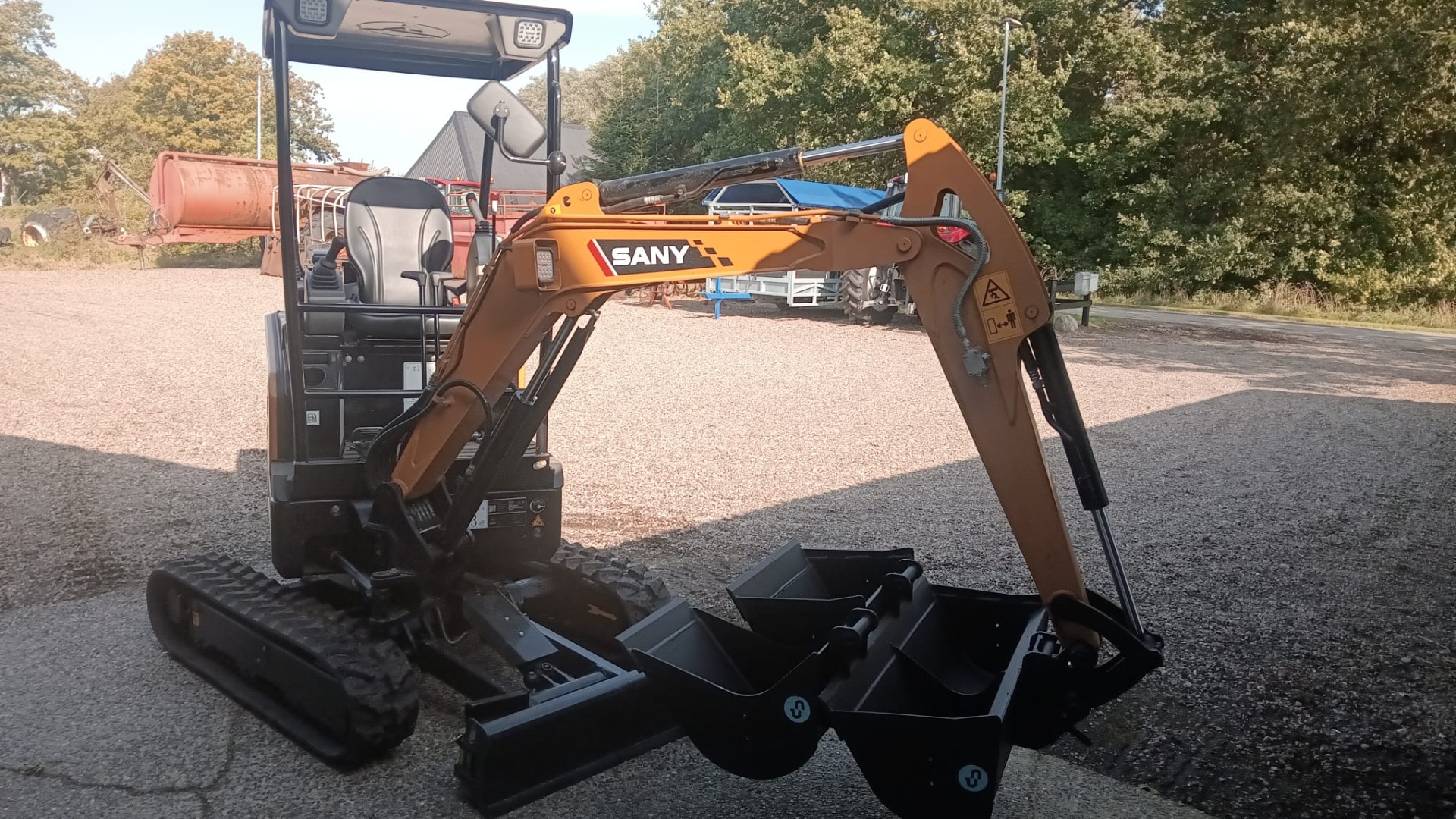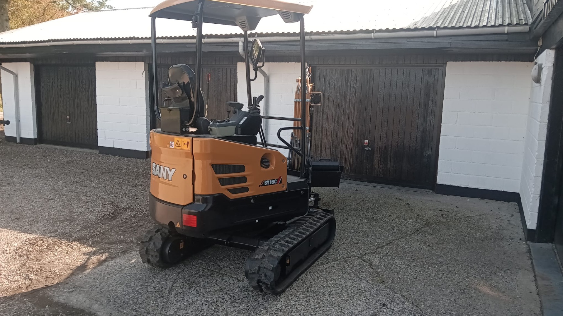 Sany sy16, med påmonteret s30-150 skifte, samt skovlpakke bestående af 3 skovle(110cm, 60cm og 40cm) fra CP skovlfabrik.